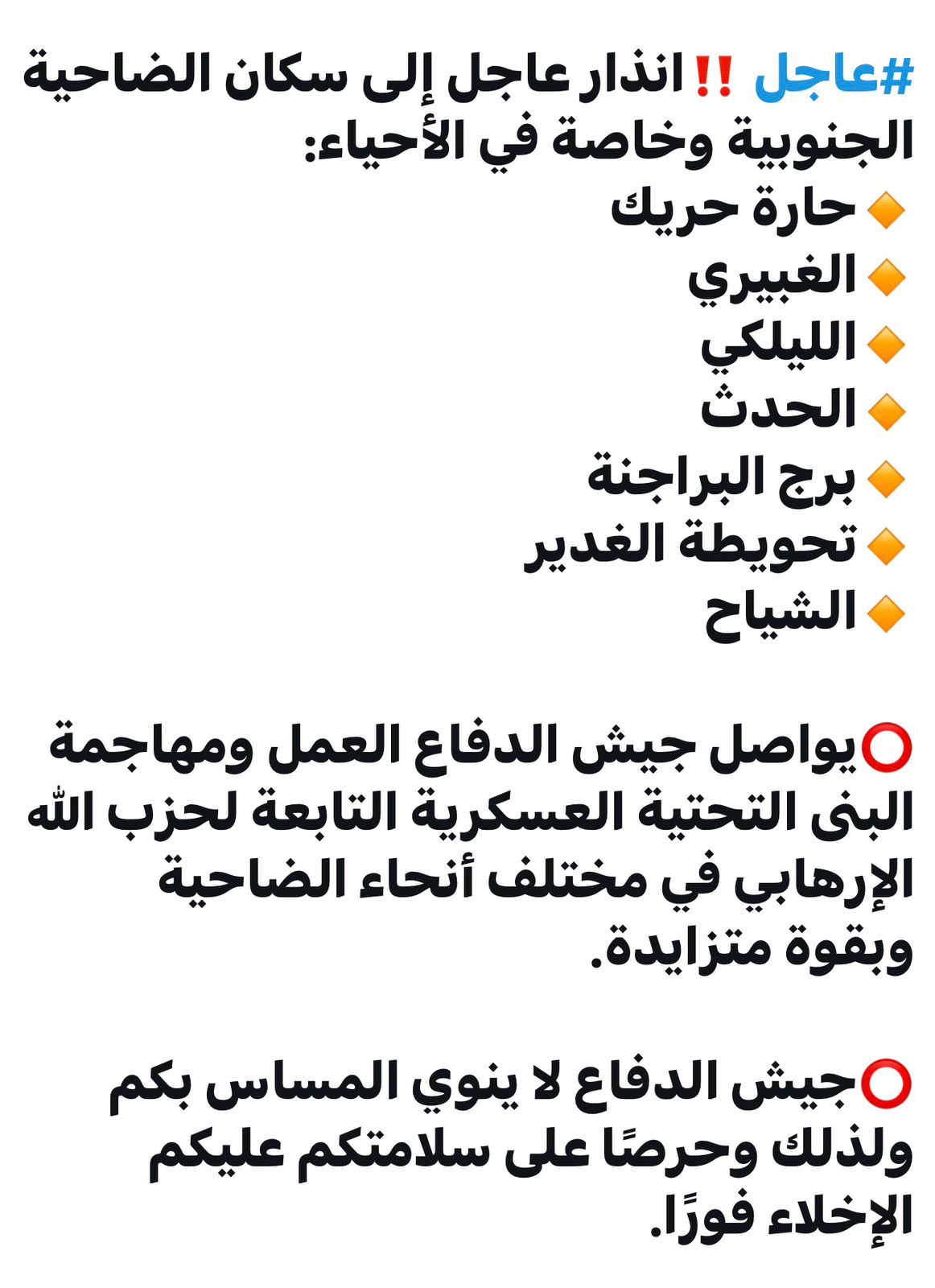 انذار جديد للضاحية. 🖍️عاجل ‼️انذار عاجل إلى سكان الضاحية الجنوبية وخاصة في الأحياء:🔸حارة حريك🔸الغبيري🔸الليلكي🔸الحدث🔸برج البراجنة🔸تحويطة الغدير🔸الشياح ⭕️يواصل جيش الدفاع العمل ومهاجمة البنى التحتية العسكرية التابعة لحزب الله الإرهابي في مختلف…