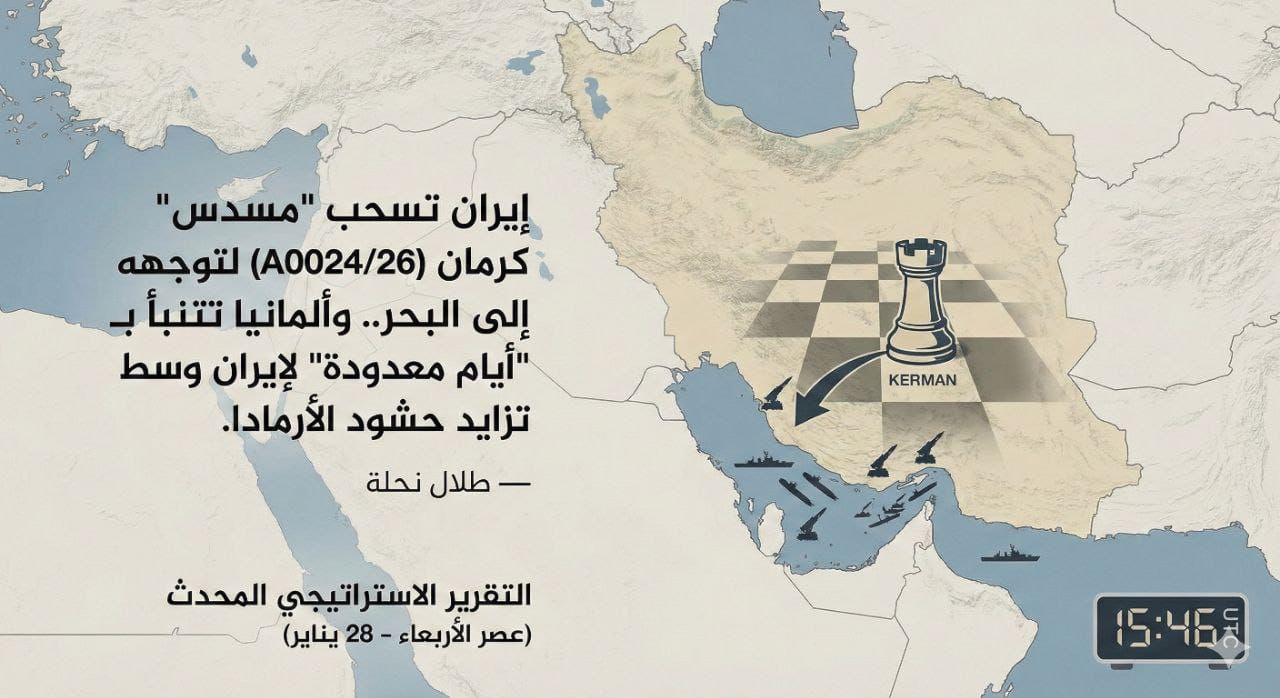 إيران تسحب “مسدس” كرمان (A0024/26) لتوجهه إلى البحر.. وألمانيا تتنبأ بـ “أيام معدودة” لإيران وسط تزايد حشود الأرمادا. — طلال نحلة