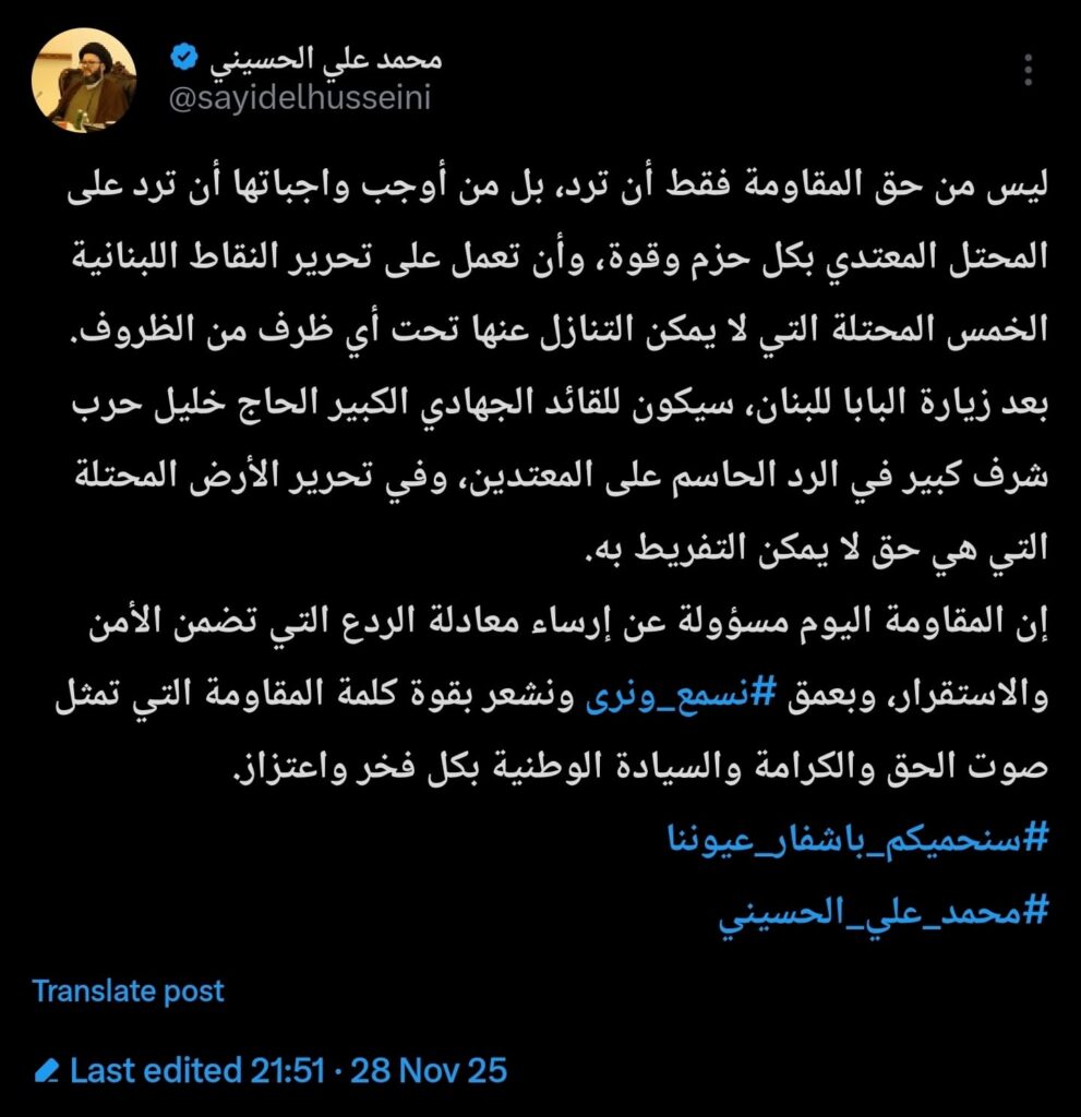 عاجل عاجل:الحسيني ينشر تحذير الى اهالي بعلبك الهرمل