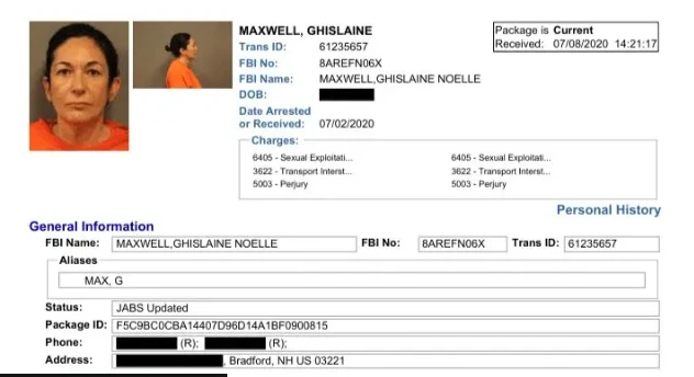 من بين الملفات المتاحة صورغيسلين ماكسويل، في نظام الحجز الآلي المشترك، الذي يستخدم لتسجيل المتهمين بمجرد إلقاء القبض عليهم.