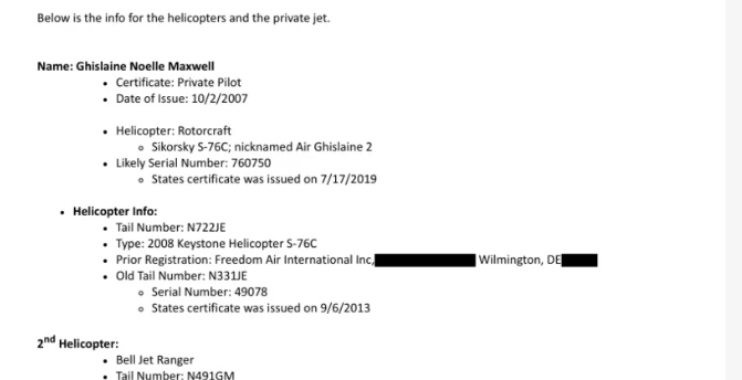 ومن ضمن الوثائق التي نُشرت على موقع وزارة العدل الأمريكية، رسائل بريد إلكتروني، يطلب من خلالها عميل في المباحث الفيدرالية، تم تغطية اسمه، معلومات خاصة بطائرات الهليكوبتر التي تمتلكها ماكسويل وكذلك طائرتها الخاصة.